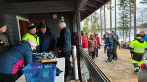 Tuloksia odotellessa pilkkijät saivat nauttia Sirpan ja Irman makkarakeitosta tai mokkapalakaffeista. Raija hoiti maksupuolen ja Maija arpamyynnin Sirpan avustuksella. Arpajaisvoittoja olikin villapaidasta, haravaan, tuotepaketteihin, pipoon, käsineisiin ja lahjakorttiin asti joten Maijalla ja Inkerillä riittikin arvottavaa.